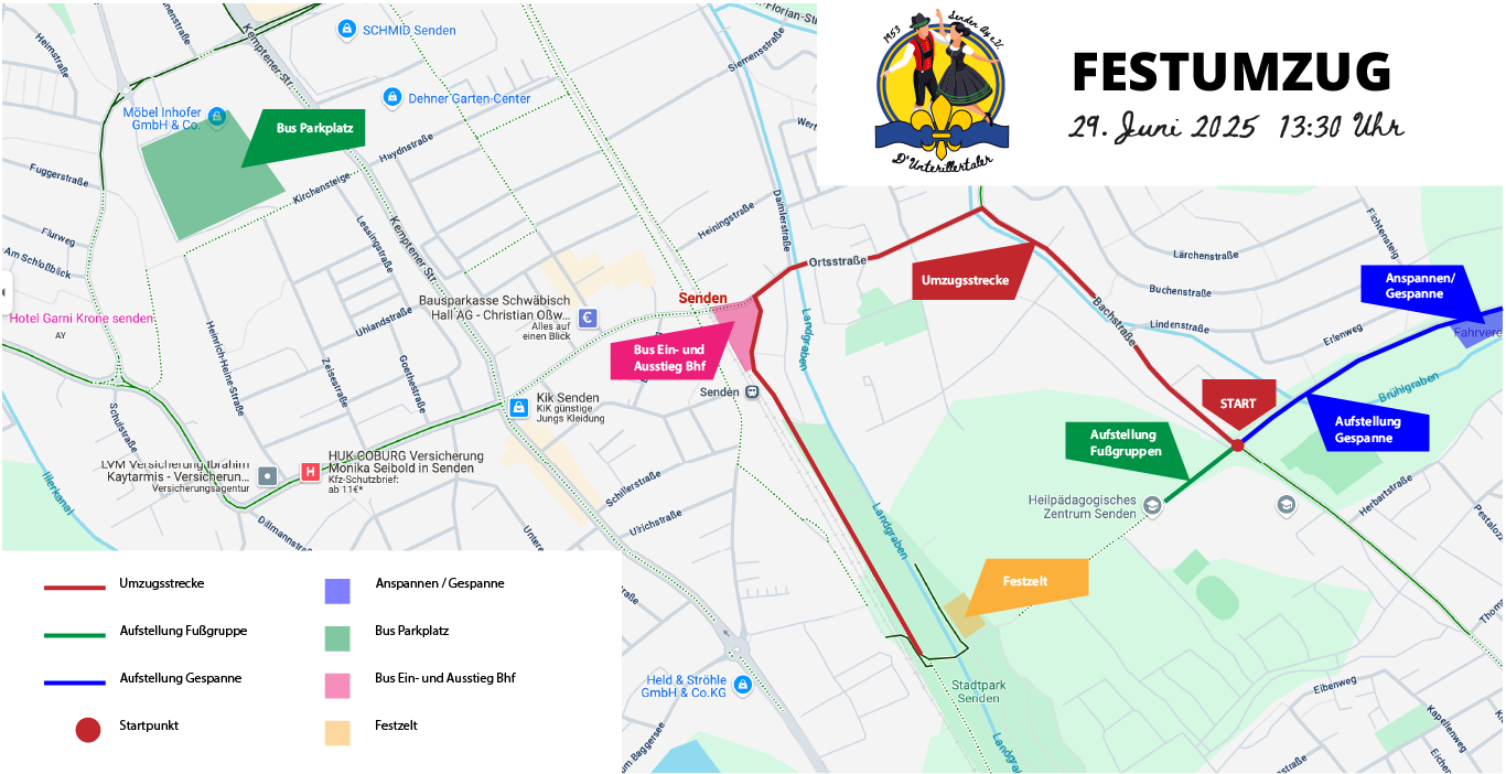 4. Aufstellung Festzug: Gemäß Plan für Fußgruppen bei der Mittelschule, Gespanne entlang der Hittistetter Strasse. Für ältere Trachtler haben wir 2 Gesellschaftswagen zum Mitfahren bereitgestellt: Die Trachtler der Gruppen Nr. 5 bis 20 fahren im Wagen Nr. 10. Die Trachtler der Gruppen Nr. 21 bis 41 fahren im Wagen Nr. 30.